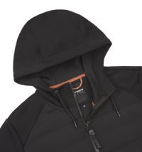 Dvě přední kapsy se zapínáním na zip, nastavitelná kapuce na tkaničku. Mírně přiléhavý střih. Vysoce pohodlná, elastická hybridní bunda pro aktivní pohyb.